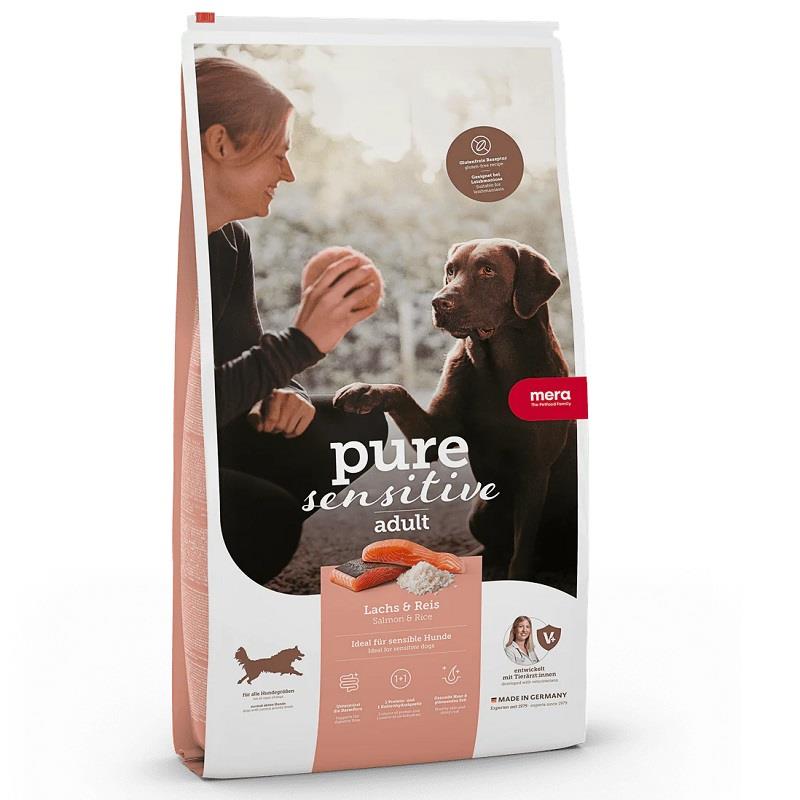 MERA saf somon ve pirinç ile hassas sindirimi, gıda intoleransları veya diyet sorunları olan hassas köpekler için özellikle lezzetli eksiksiz bir köpek mamasıdır.